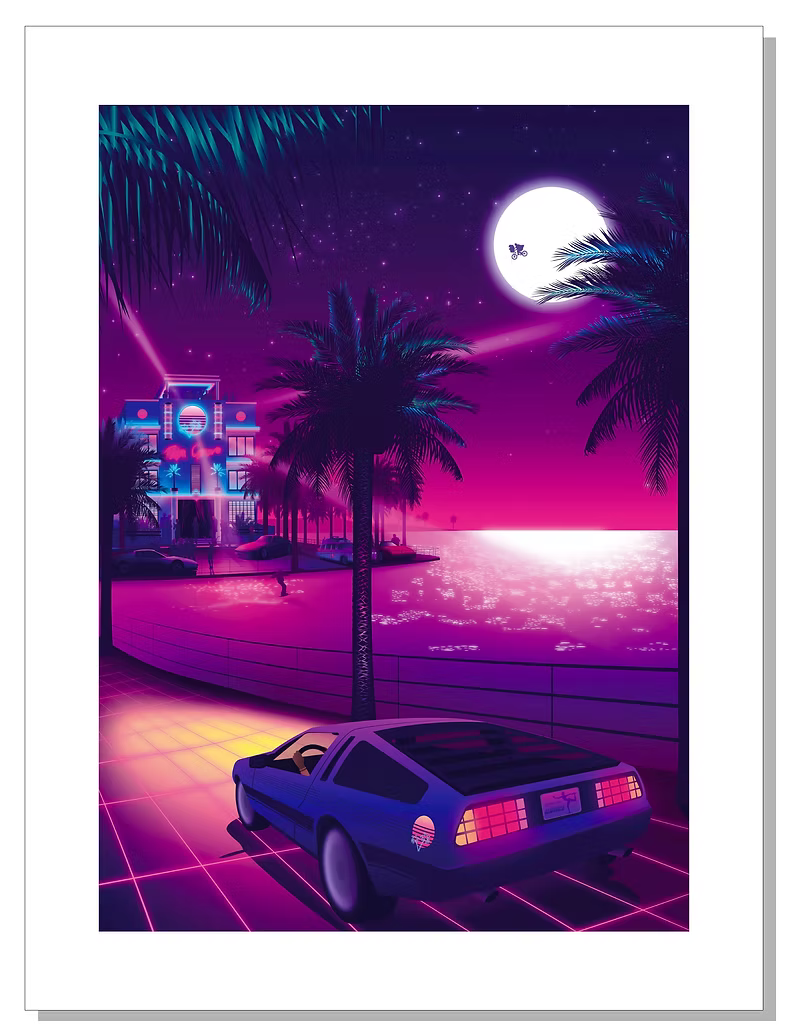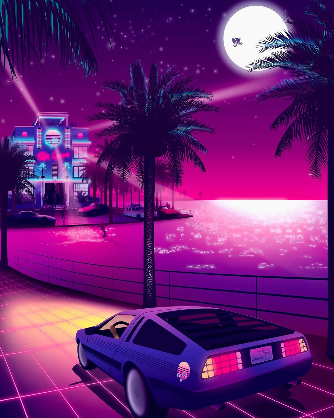 Les reflets d’une lune géante scintillent sur la mer et rivalisent avec les lumières d’un édifice énigmatique.