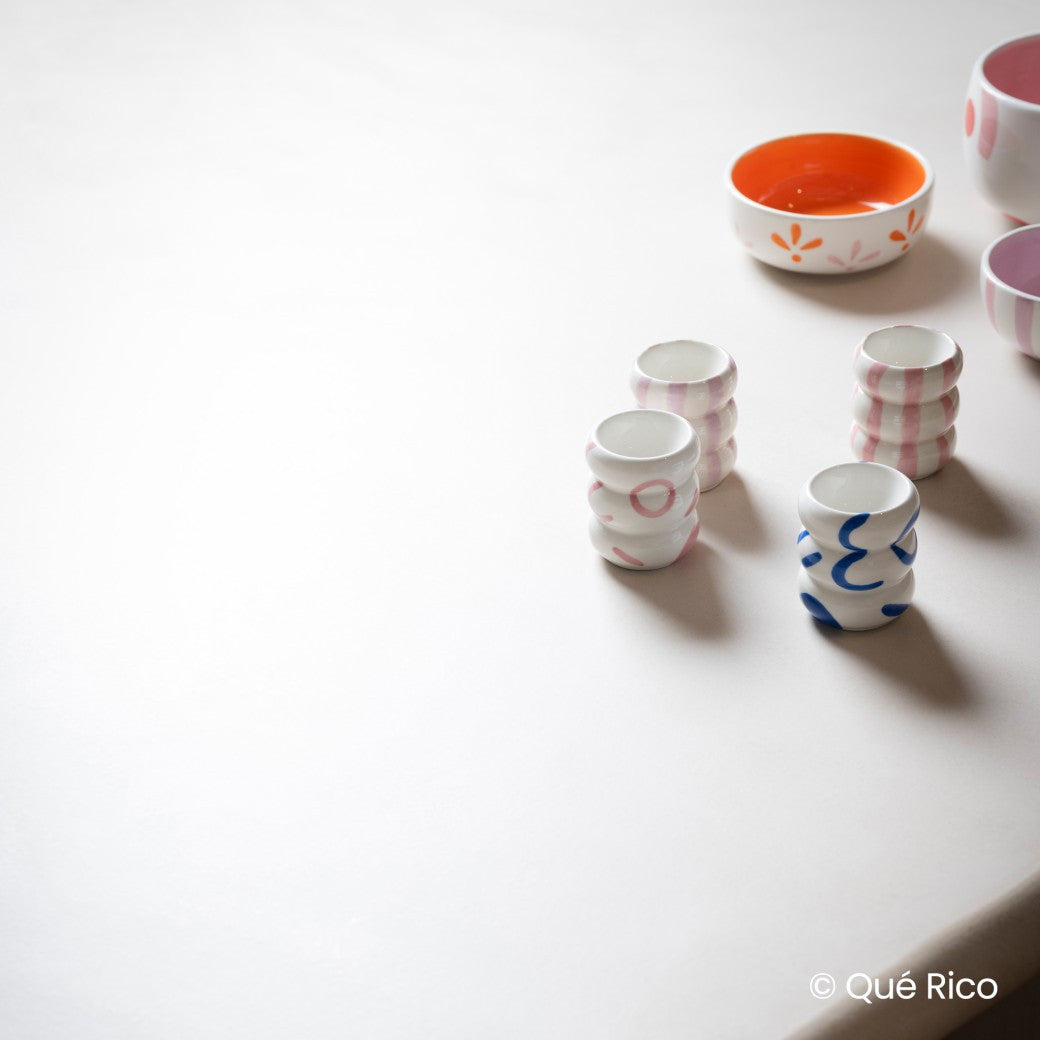 Conçus en Belgique et d'inspiration espagnole, ces coquetiers arborent le motif coloré Abstract Madness. Avec sa forme cylindrique nervurée et ses combinaisons de couleurs amusantes (blanc, rose et bleu), cet ensemble artisanal apporte une touche d'éclat à votre table.